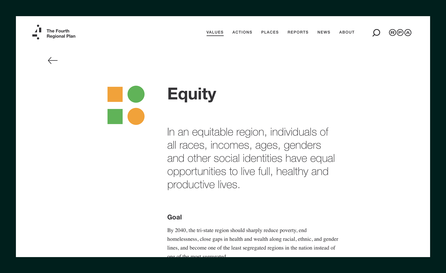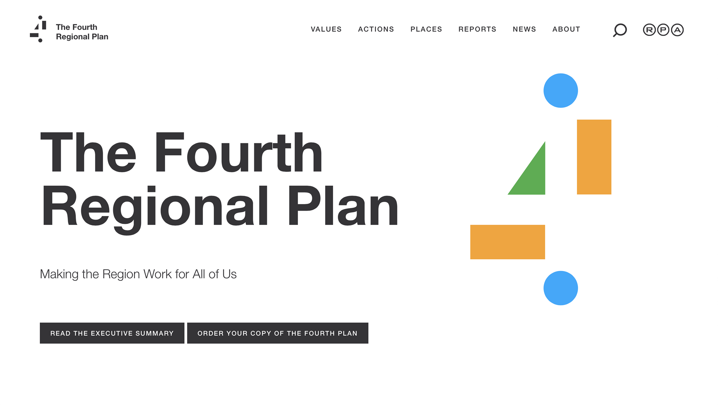 The website was designed as the primary interface for understanding the regional development plan, allowing users to move fluidly between high-level vision, detailed recommendations, and supporting data. The branding system, built around simple geometric shape, also functions as a navigational and organizational device, helping users recognize themes and orient themselves across the plan.