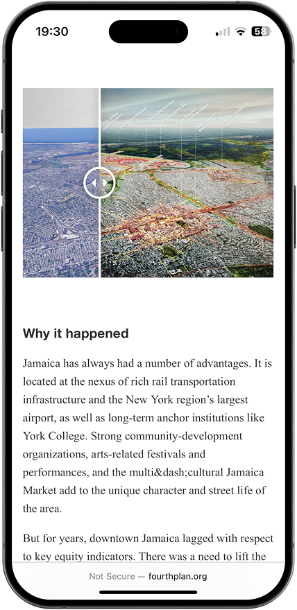 Because the website was the primary access point for the plan, clarity and readability were central design considerations. Content was broken into digestible sections with clear hierarchy, consistent layouts, and strong typographic structure. This approach allows users to understand the plan incrementally, whether they are skimming key ideas or diving deeply into specific topics like housing, transportation, equity, or climate resilience.