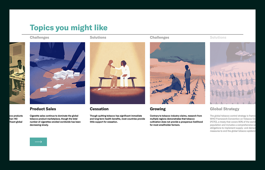 The art direction translated into a bold, purpose-driven UI that balances urgency with clarity, using immersive visuals and chapter-based navigation to guide visitors deeper into the story of tobacco control.